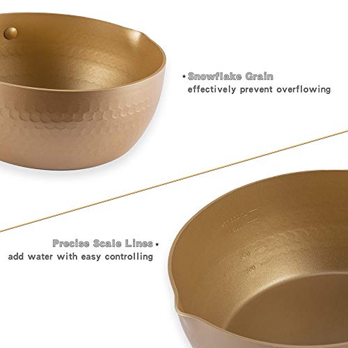 - Design for Better Cooking Bottom in saucepan with a radian for thorough stirring; Snowflake grain in the surface ensures reducing boiling time to avoid overflowing; two-sided pour spouts for pouring from either side
